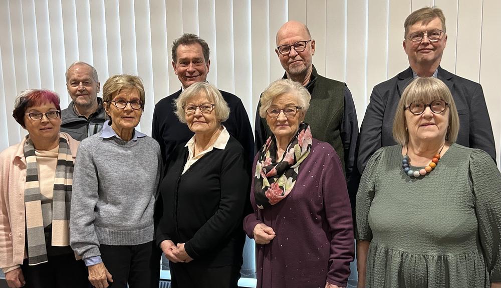 Uusi piirihallitus vuodelle 2026: ylärivissä Harri Lehtinen, Simo Tyynelä, Jari Rantamäki ja Jouko Lahti, alarivissä seniorilähettiläs Eija Alakangas sekä hallituksen jäsenet Ritva Nirkkonen, Reetta Porkka, Eira Björlund ja Ulla Halttunen.